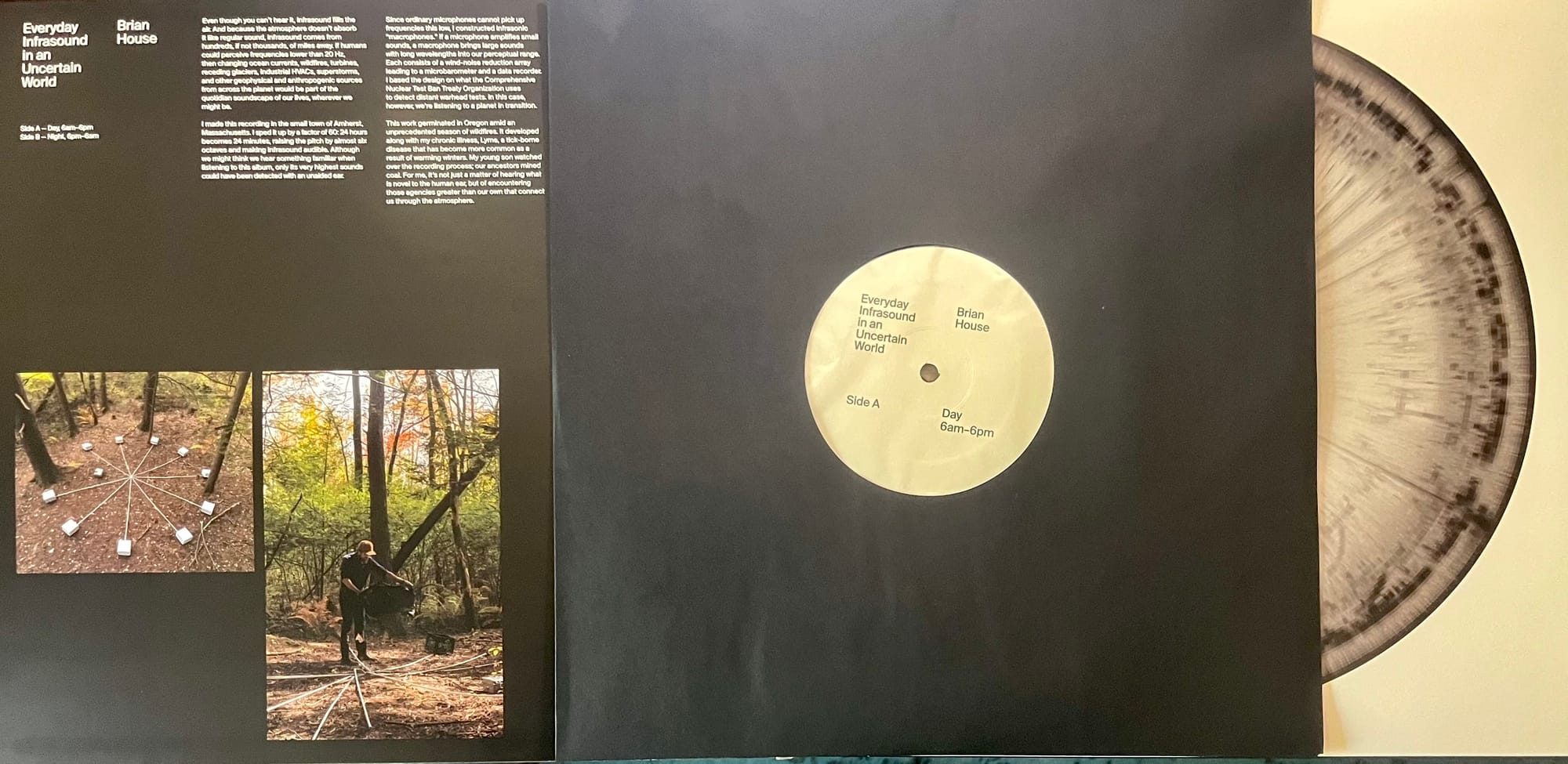 This month, Brian sent me his latest LP, which transforms the hugest of soundwaves into the audible cries and shudders of a planet in crisis. Recorded in Amherst, Massachusetts using self-built “macrophones”—large-scale microbarometers designed to detect infrasonic waves (below ~20 Hz)—House records the infrasound that constantly penetrates our bodies, often from hundreds or thousands of miles away.