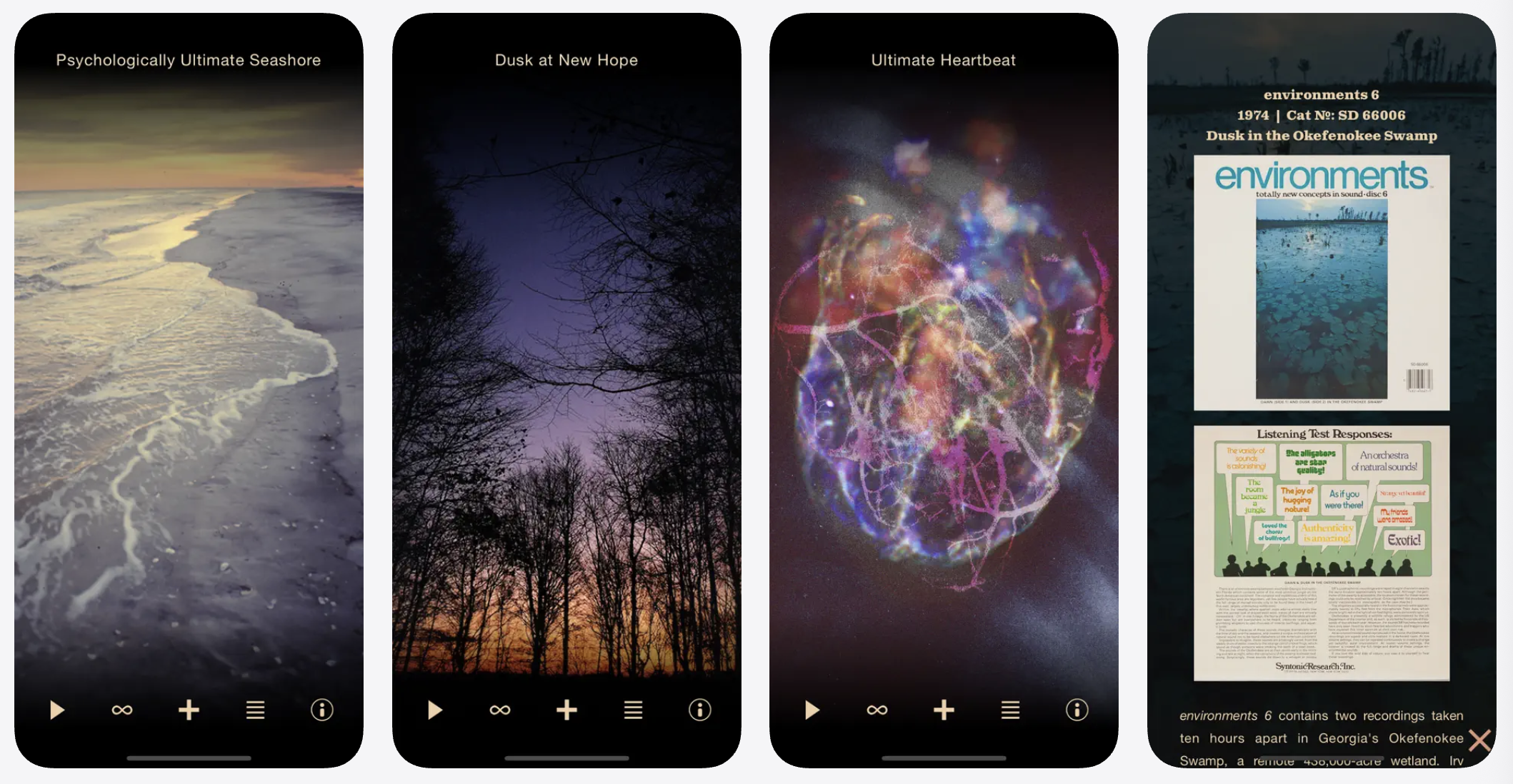 Environments app for iOS (Numero). Many readers will know that I have mixed feelings about "orphic media," the sonic technologies that help us concentrate or relax but also cut us off from the world. But beyond any ethical or philosophical concerns, most nature sound apps just kind of suck. The sound quality is often mid to bad. Or the loops are too short, which denatures the "nature" and amplifies the artifice, blowing the whole charade on both aesthetic and functional levels.